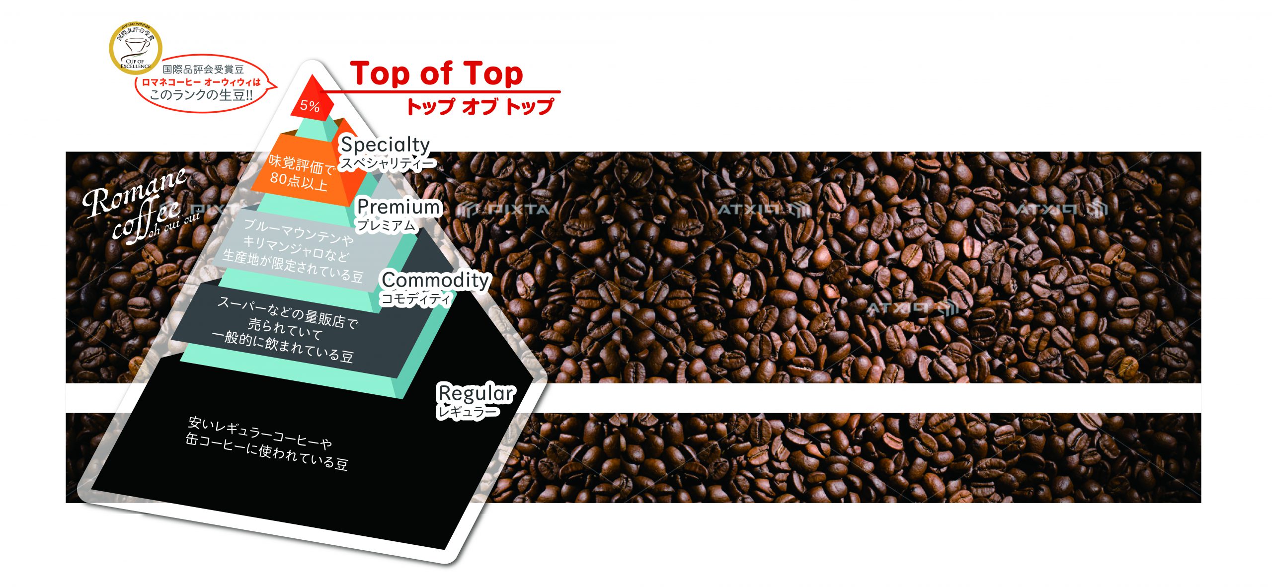 コーヒー豆のランクを表す「コーヒーピラミッド」トップ・オブ・トップの割合は、世界でわずか 0.01%