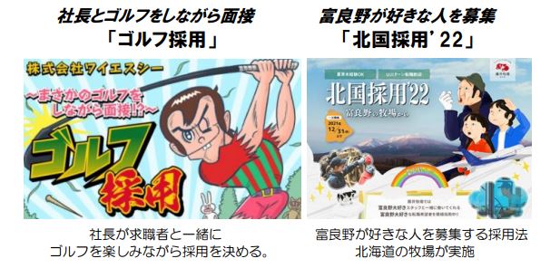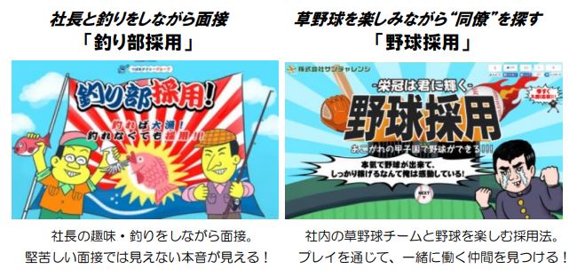 例えば、社長の趣味が釣りならば、求職者と釣りをしながら採用を判断する“釣り部採用”、社内に草野球チームがあれば、求職者と野球を行い採用を判断する“野球部採用”を提案している。