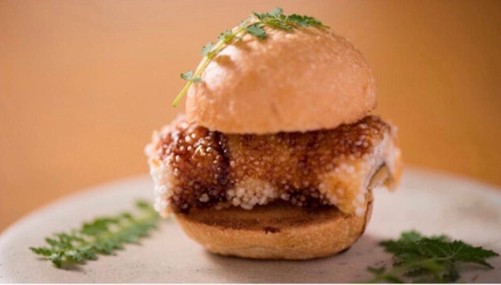 柔らかく蒸した天然うなぎにおかきをまぶして揚げ、鰻のタレをかける。さらに、ブルーベリーの醤油ソースとパッションフルーツ、木の芽も挟んだバーガー。