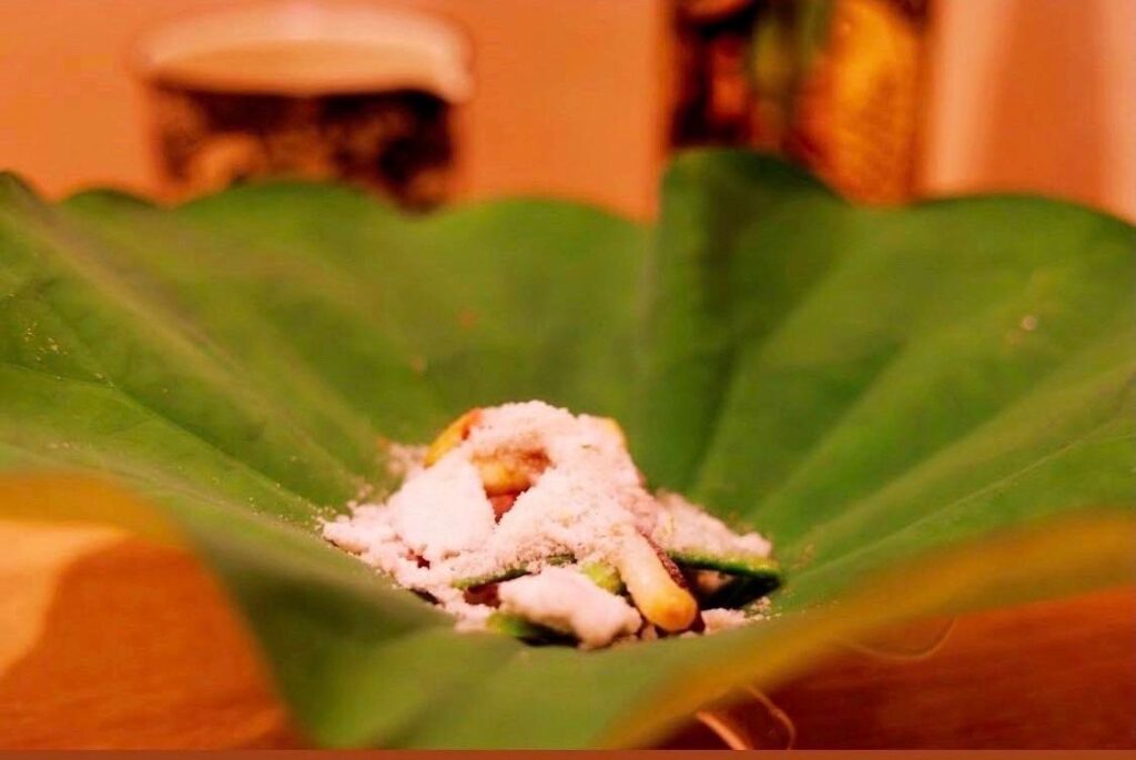 鮟肝とフルーツのマンゴー、西瓜の奈良漬けを炭を練り込んだモナカの皮で一緒に挟んだ一品。マンゴーの爽やかさが鮟肝の独特な臭みを抑え、濃厚な旨味を引き立たせる。そこに西瓜の奈良漬けの風味も加わり、意外な組み合わせが驚きの美味しさを生み出す。
