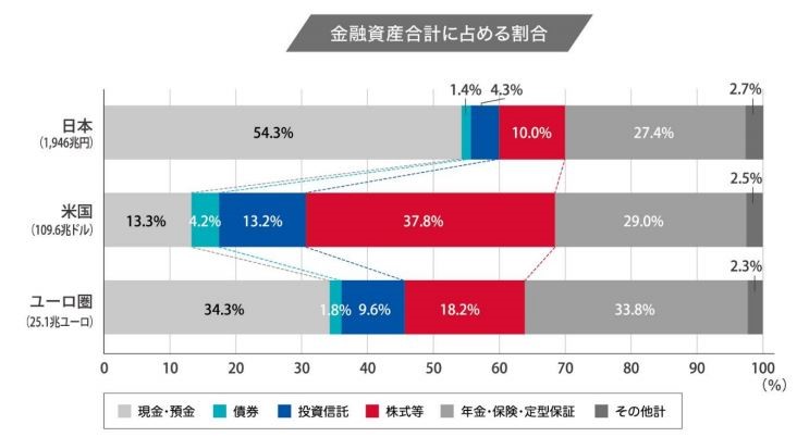 日本の家計の金融資産は約1946兆円。その内訳は「現金・預金」が約54%で、「株式・投資信託」は約14%。米国では「現金・預金」は約13%、「株式・投資信託」は約51%となっている。