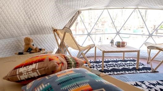 長野県塩尻市にあるグランピング施設「エンキャンプ」は、2,500 坪の広大な敷地にドーム型テント8棟を擁し、テント外には BBQ 設備も完備。快適なキャンプ体験ができる。
