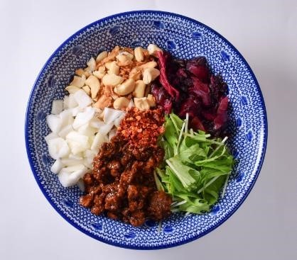 看板メニュー「担担麺」(900 円)は、タレに唐辛子や山椒など 20 種以上のスパイスを使い、辛みとしびれが特徴。全粒粉などを使う独自配合の平打ち麺に、神戸ポークと淡路島産のタマネギ、しば漬け、水菜、砕いたカシューナッツを乗せた逸品!