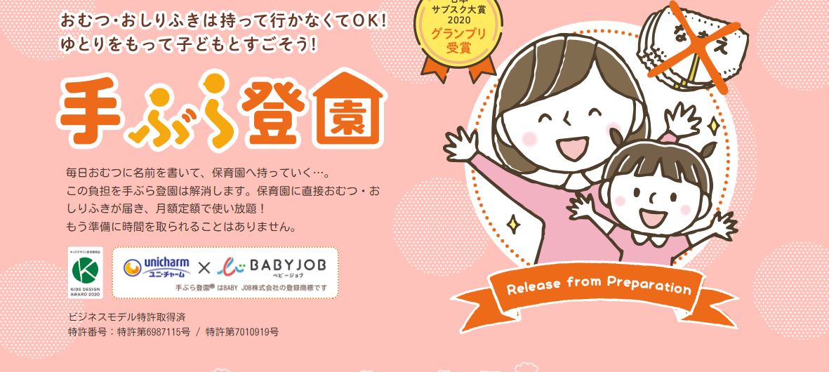 「手ぶら登園」とは、保育施設で紙おむつが使い放題になる日本初のサブスクサービス。2019年に提供開始後、現在では全47都道府県・約3000の保育施設が導入する人気サービス!