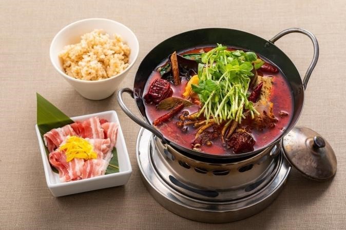 「一人薬膳辣湯(ラータン)鍋」(単品 1,380 円、漢方三元豚・玄米セット 1,800 円)