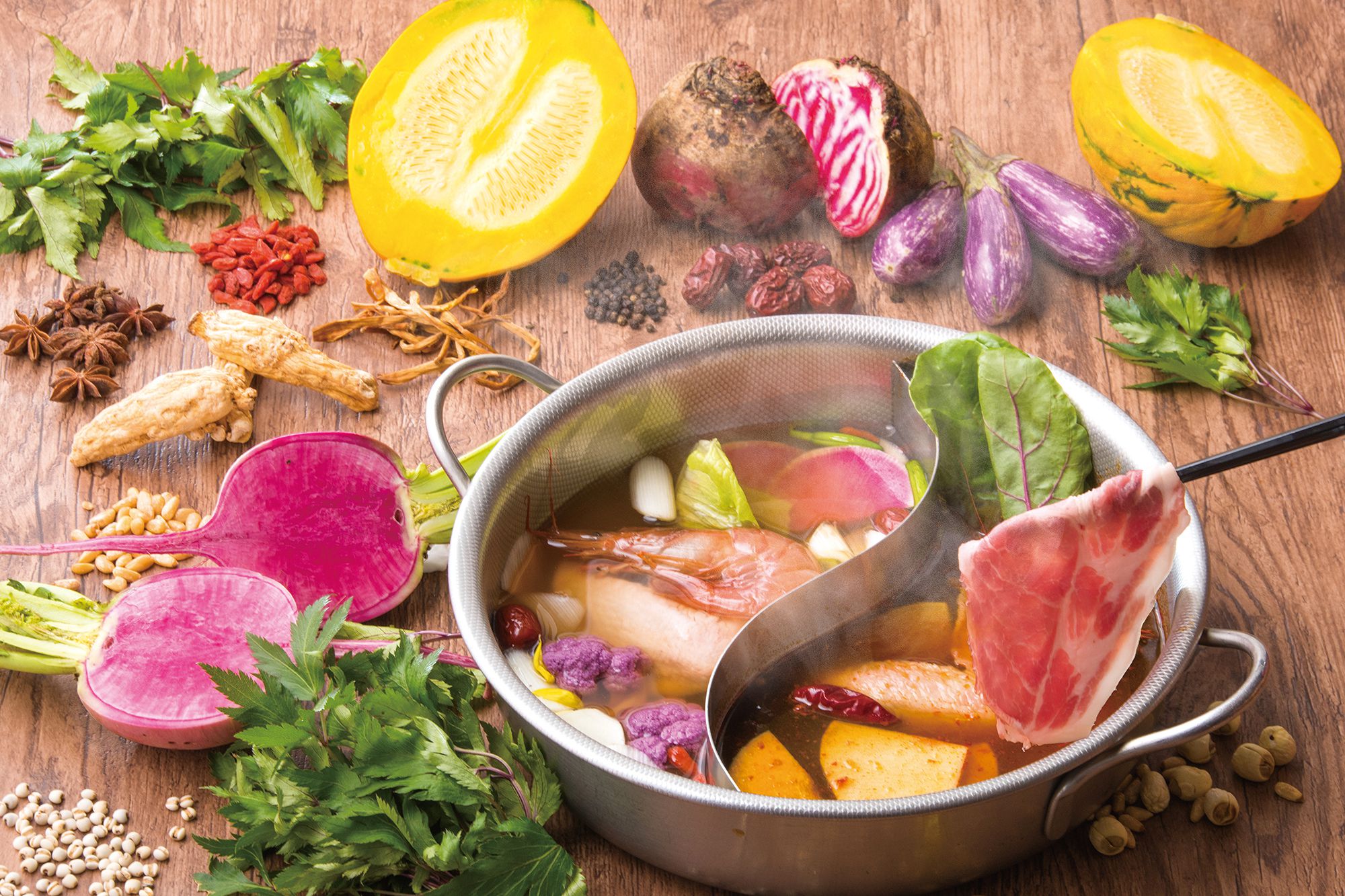 「一人薬膳辣湯(ラータン)鍋」(単品 1,380 円、漢方三元豚・玄米セット 1,800 円)