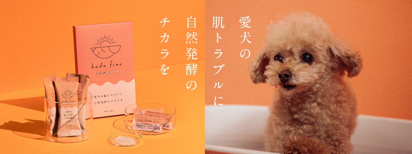 「わんちゃんの皮膚の厚さは、人間の皮膚の 3 分の 1 ととても薄いため、デリケート…。しかし、自らの皮膚について伝える術を持たない…。なんとか肌トラブルから守ってあげたい」そんな思いを持ち、愛犬用入浴剤「hada fine」を 1 年半かけて開発に成功!