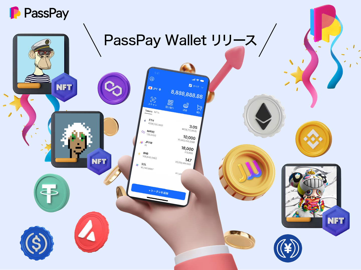 「PassPayWallet」では、日本円ステーブルコイン「JPY World(JPYW)」(※)や、対応ブロックチェーンネットワークの暗号資産、NFT をワンストップで管理可能!
