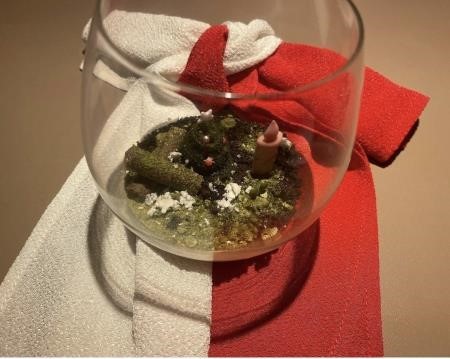 12 月には“クリスマスの京都”を表現したコースを提供!前菜の「サンタの森」から始まり、京都の冬の風物詩「ジョミナリエ」のイルミネーションを表現した八寸、京都・北山のキャンドルナイトを抹茶のガナッシュなどで表現したデザートなどを提供。