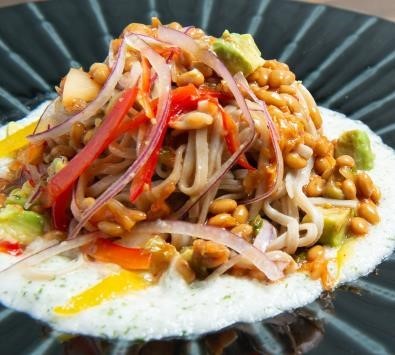 鮮やかな見た目の蕎麦タワーは芸術品。納豆・キムチ・アボカド・しそ風味の
