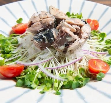 太打ちの十割蕎麦に鬼おろし・貝割れを敷き詰め、底をくり抜いたサヴァ缶を置いた見た目ユニークなマニア蕎麦。缶を持ち上げるとゴロっと鯖が出てくる。