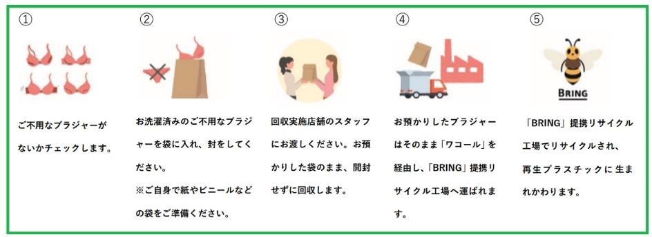 「ワコール ブラリサイクル」は、“ブラジャーは捨てにくい”というお客さんの声から生まれた不用になったブラジャーを回収・リサイクルする活動。ブラジャーは金具やワイヤーが含まれ、分解しなくてはならないため捨てにくい。。衣類回収サービス「BRING」のサプライチェーンにてコークス炉化学原料化法によって、再生プラスチックなどに生まれ変わる。