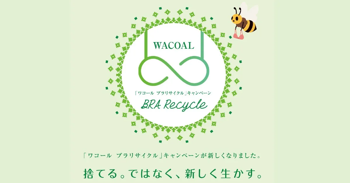 「ワコール ブラリサイクル」は、“ブラジャーは捨てにくい”というお客さんの声から生まれた不用になったブラジャーを回収・リサイクルする活動。ブラジャーは金具やワイヤーが含まれ、分解しなくてはならないため捨てにくい。。衣類回収サービス「BRING」のサプライチェーンにてコークス炉化学原料化法によって、再生プラスチックなどに生まれ変わる。