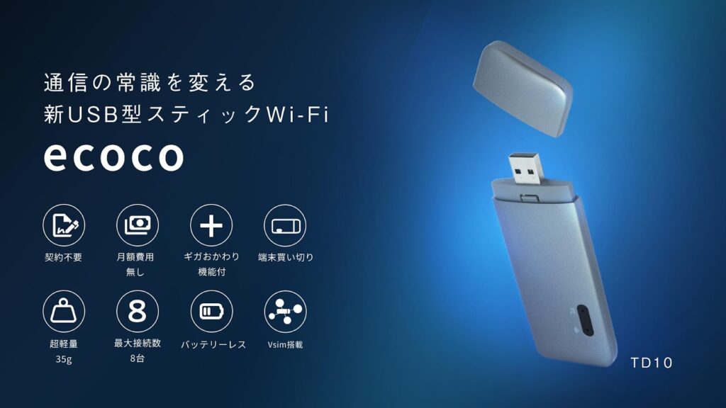 【バッテリーレスタイプなので破裂の危険がない!】USBに差すだけで簡単に繋がるUSB型スティックWi-Fi 「ecoco(イココ)」
