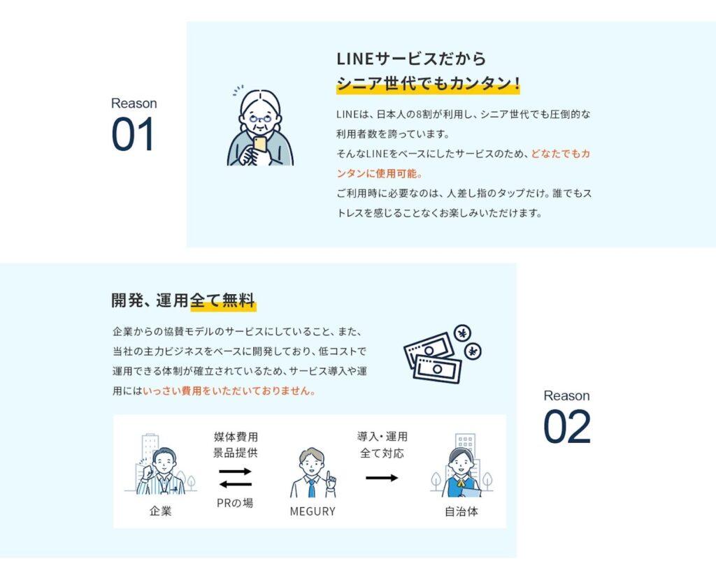 LINEで完結するシンプルな操作性になっており新しいサービスの導入に抵抗を持つ高齢者でもLINEの操作性であれば、新たに覚えたり、設定したりする必要がないと考えた。