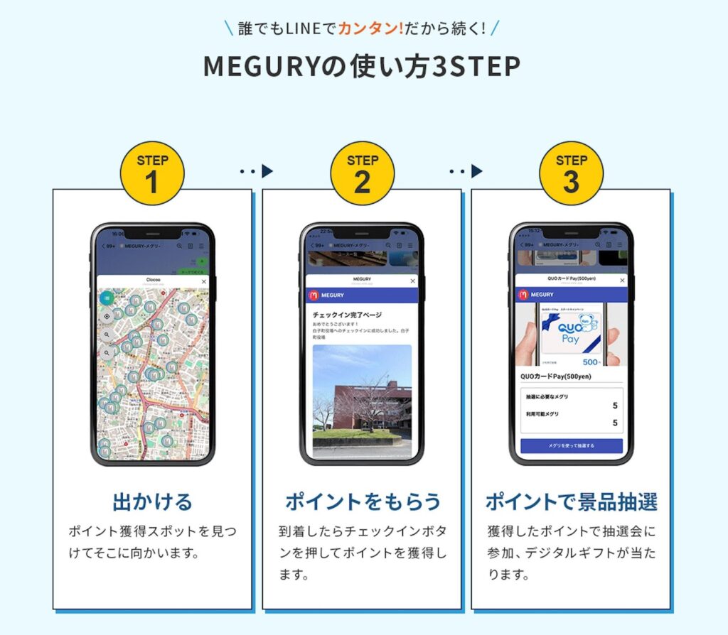 MEGURYはLINEアカウントと位置情報を組み合わせたスタンプラリーを提供するサービス。