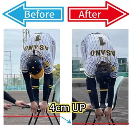 その結果、打撃飛距離が最大10%(7m)アップ、肩の可動域が平均63%(23.9cm)アップし、前屈が平均31%(3.25cm)アップ、体幹強化による盤石な安定感