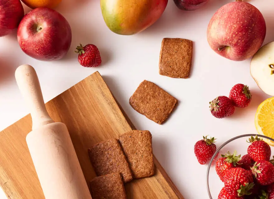中山シェフ協力のもと、半年間試作を作り続けて、現在のフルオーツが完成した。3枚で10gの食物繊維を配合するため、小麦粉や米粉の代わりにおからとオートミールを使用。独自の配合と焼き方でザクザクとした食感を実現している。