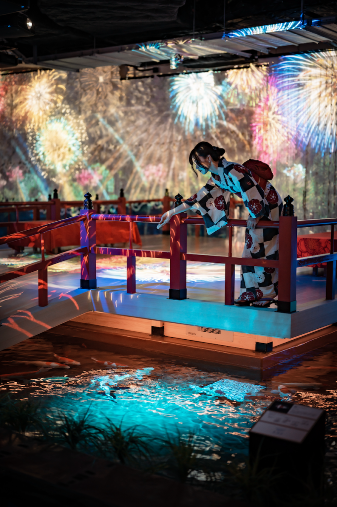 ガラス床の中にはニシキゴイ、360度のデジタルアートが楽しめる「MIYABI」