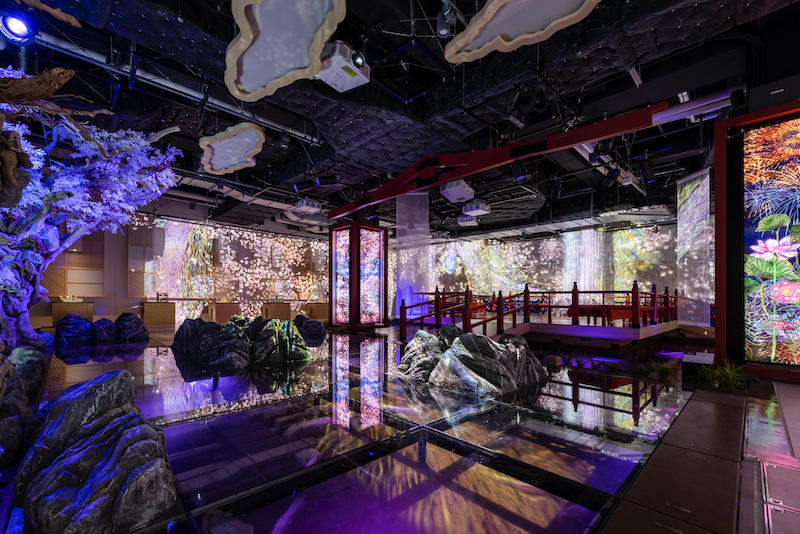 さらにプロジェクターから桜や花火、雪の結晶などの映像を投影し、四季をイメージした演出も圧巻で360度のデジタルアートが楽しめる。