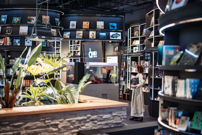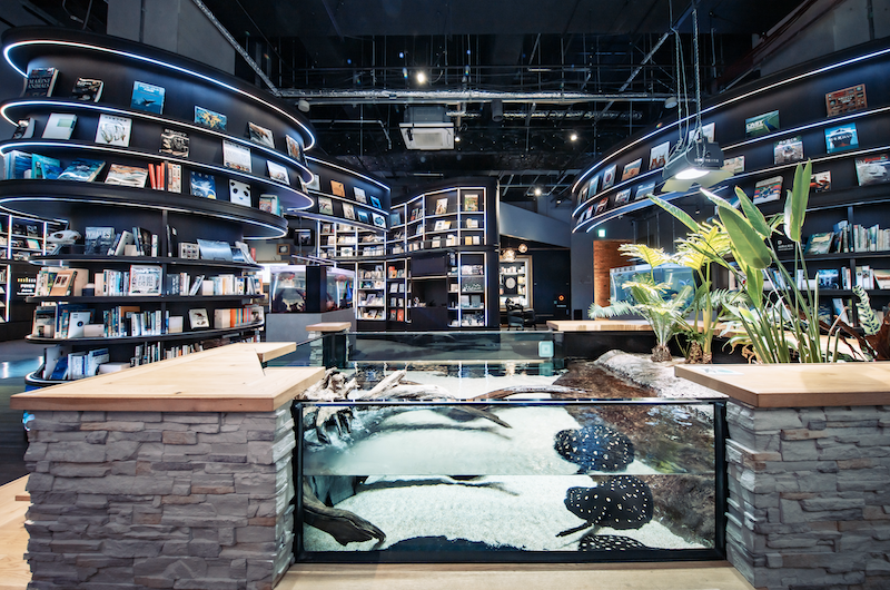 壁面が約2,500冊の書籍で埋め尽くされ、館内でも特に学びをテーマにしたエリアで生きものの標本や映像、テラリウム展示なども織り交ぜられ、知的好奇心が刺激される。