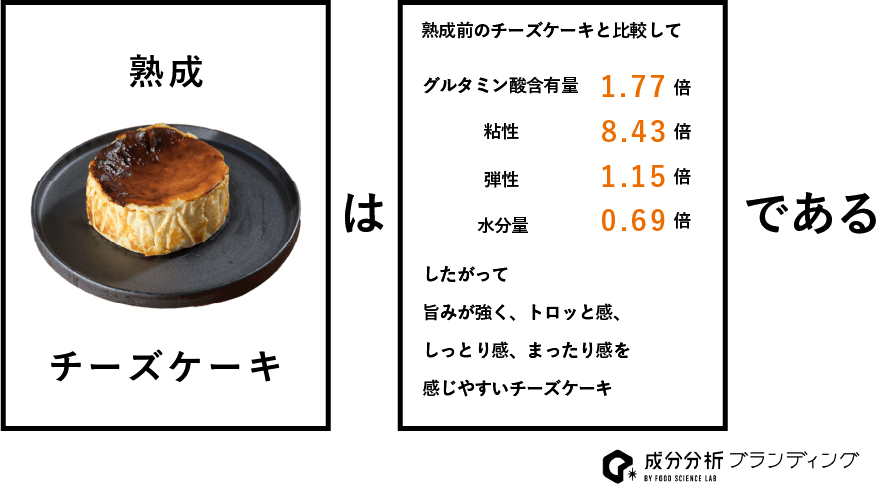 スイーツ業界では初めてとも言われる、品質の数値化に成功した結果、通常のチーズケーキの熟成前のものと比較して旨味成分(グルタミン酸)が約1.77倍多いことを証明。また、粘性が約8.43倍、弾性が約1.15倍、水分率が約0.69倍であることも証明された。