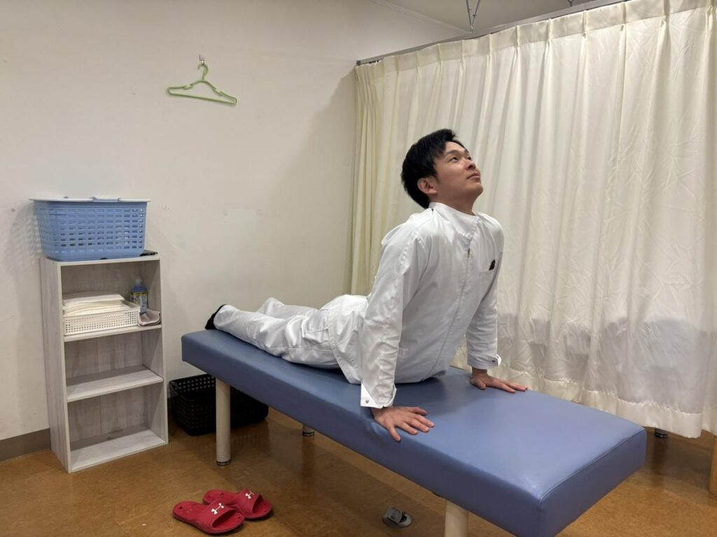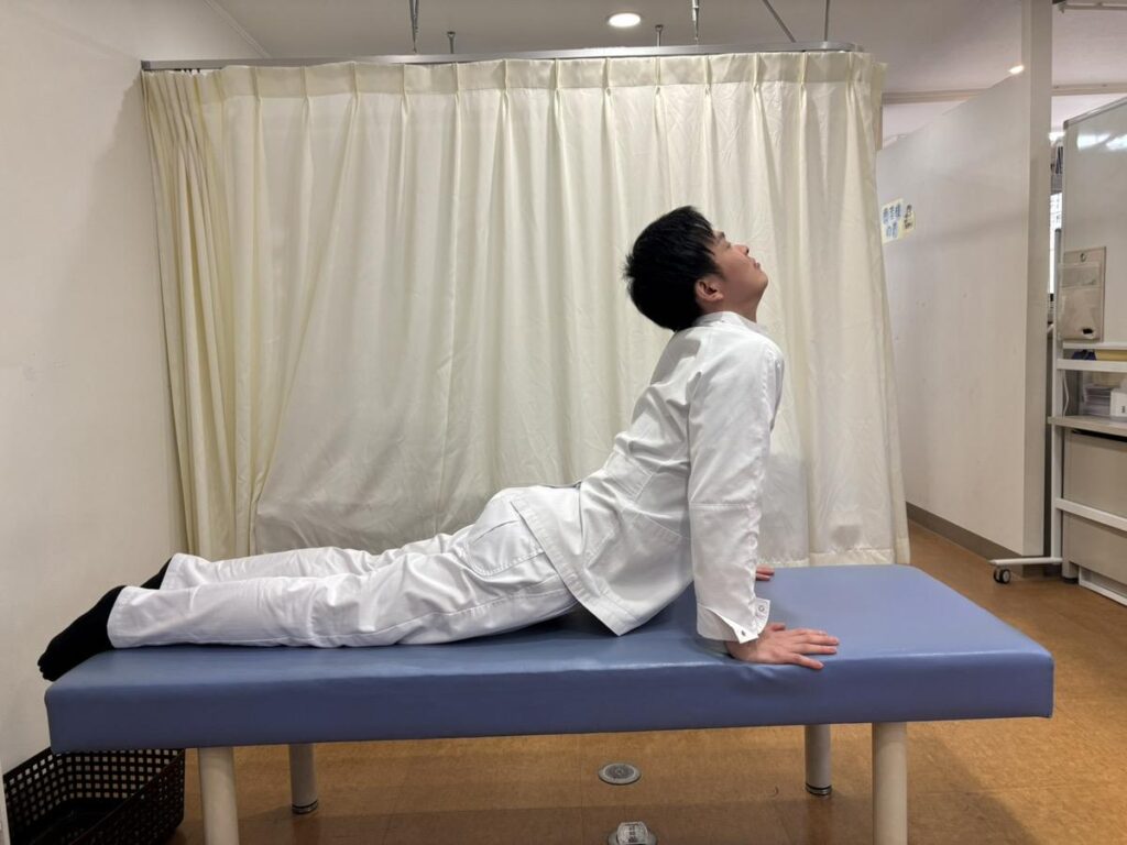 3. 胸を張った状態で呼吸を繰り返し、お腹前面の伸びを感じながら30秒ほどキープする。
