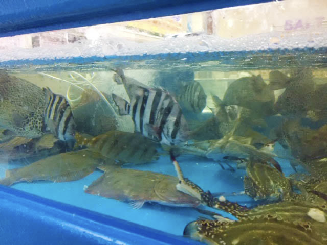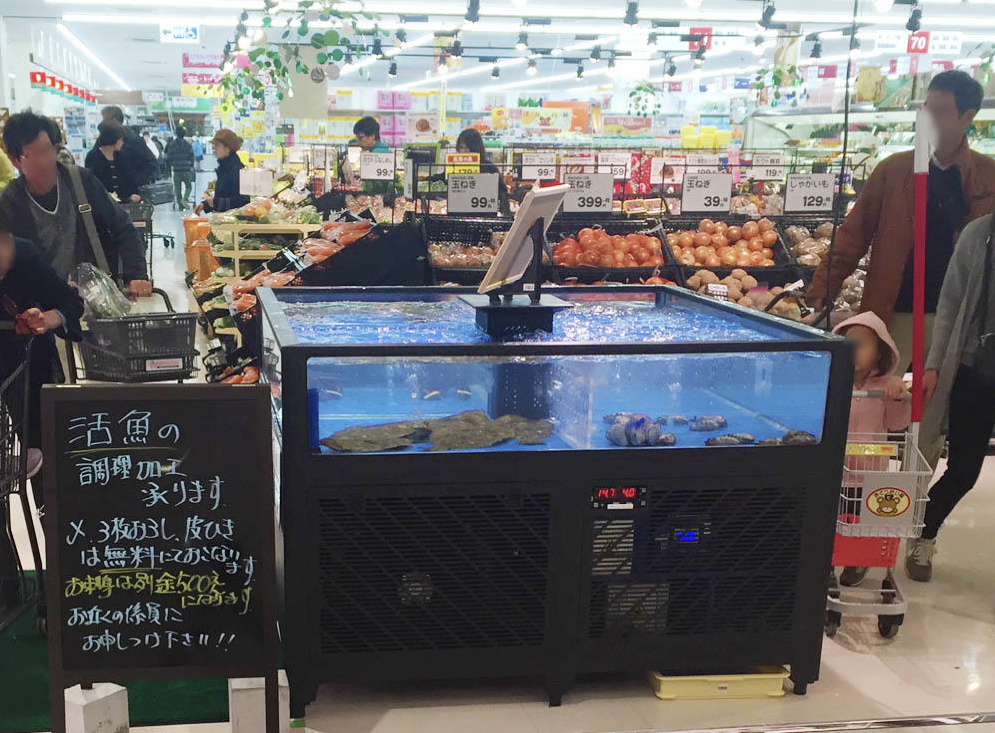 魚売り場のいけすの魚は、頼めばその場でさばいたり、刺し身などにしてくれる。。