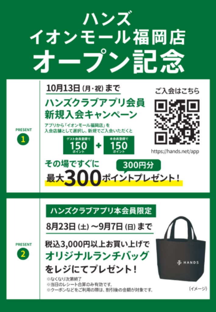 ハンズ イオンモール福岡店で税込 3,000 円以上お買い上げのハンズクラブアプリ会員※のみなさま、先着 1,600名様に「オリジナルランチバッグ」をプレゼント!