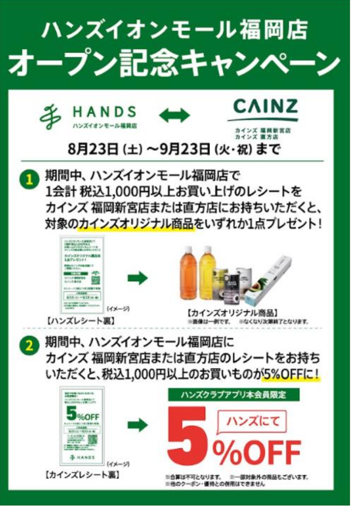● カインズ福岡新宮店または直方店のレシートでハンズ イオンモール福岡店のお買物※1 が 5%オフ※2 になります