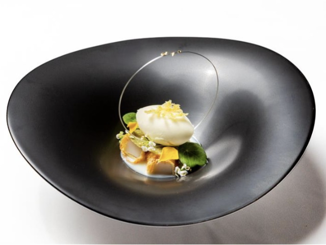 ゆずの香りを感じるわさびのアイス日本酒の香りを残したくずもちを一皿に仕上げた。