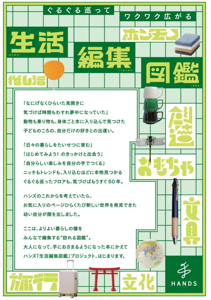 ハンズを訪れた人が「暮らし」をテーマに集められた“モノ・コト・ヒト”と出会い、日々のくらしをよりよくアップデートする編集感覚を持ち帰ることができる、”訪れる図鑑”としてリブランディングするプロジェクトです。