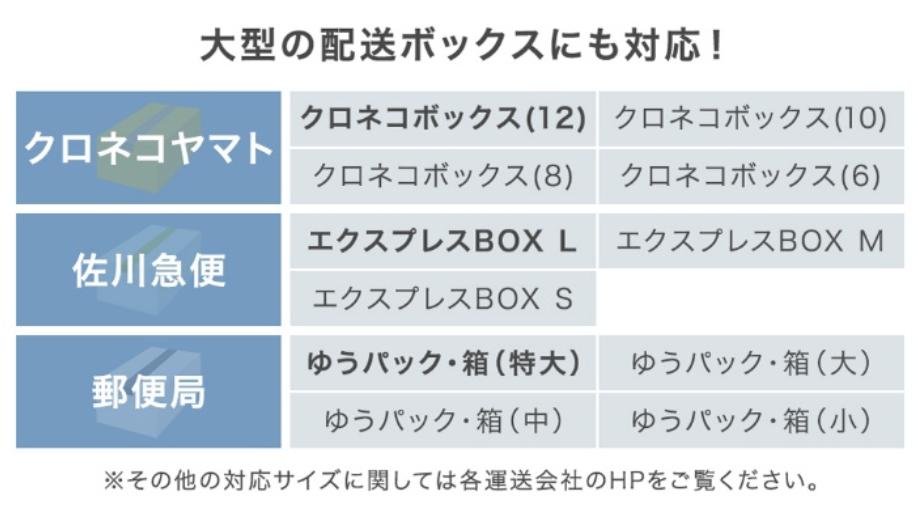 本製品の容量は75Lあり、宅配便で一般的に使用される60~80サイズ程度の中型段ボールやゆうパック特大サイズといった大きな荷物にも対応可能です。