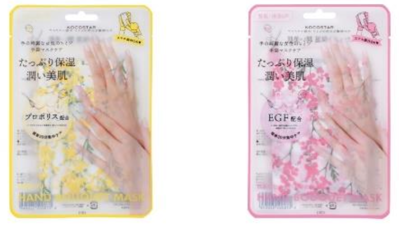 着⾊料、鉱物油、パラベン、エタノールの 4 つの成分を無添加にした、肌に優しい処⽅のハンドマスク。