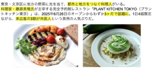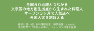 ホーム グルメ > 全国50地域とつながる 文京区の地方創生拠点から生まれた料理人 オープン3ヶ月で人気店へ 外国人客3割超える。農家に通い続ける料理研究家・藤原美穂(※取材可)地方野菜で『内側から輝く』ヴィーガン料理を提案 全国50地域とつながる 文京区の地方創生拠点から生まれた料理人 オープン3ヶ月で人気店へ 外国人客3割超える。農家に通い続ける料理研究家・藤原美穂(※取材可)地方野菜で『内側から輝く』ヴィーガン料理を提案 全国50地域とつながる 文京区の地方創生拠点から生まれた料理人 オープン3ヶ月で人気店へ 外国人客3割超える。農家に通い続ける料理研究家・藤原美穂(※取材可)地方野菜で『内側から輝く』ヴィーガン料理を提案 2025.11.04 ポスト シェア こちらのリリースにはメディア関係者向けの情報が記載されてます。 メディアユーザーログイン すでに登録済みの方はこちら メディアユーザー新規登録 登録は無料です メディアユーザー登録を行うと、企業担当者の連絡先や、イベント・記者会見の情報など様々な特記情報を閲覧できます。 ※ 内容はリリースにより異なります。 関連する記事 愛知県で伝統的に受け継がれるご当地練り物豊浜名物は「はんぺん」じゃなくて「豊浜は... 株式会社豊浜水産 フレンチ、イタリアン、焼肉、小籠包など全国から12の名店が集結!2022年1月に... 株式会社 ESSENCE ブラジル発のタピオカグルメが東京初上陸! オープン1カ月で、ファンも誕生! サク... はみ出るの次のトレンドは、はさける!?ふわとろパンに桃とクリームをはさんだ“ は... 株式会社炭平旅館 健康的な料理を“気軽に美味しく”食べられる!おひとり様女子が殺到する薬膳レストラ... 株式会社エフ・エフ・アルファ 創業 100 年の老舗米沢牛専門店が東京に進出し、人気店に!目利き社長が厳選した... 母の日、子どもの日に、ギフトとして大人気の漆黒スイーツをプレゼント!加工が難しい... アジア最大級のコーヒーイベント!昨年は69,000名が来場!最新コーヒーグッズや... SCAJ 展示会事務局 年末年始を彩る『チムニーオリジナルおせち 2026』クリスマスにも最適な「洋風オ... チムニー株式会社 【牛鍋・カレー鍋・アグー豚しゃぶなど冬注目の鍋、次々登場】 全店舗口コミ評価4.... 株式会社ウィルビー 米沢牛黄木 直営レストラン金剛閣 冬の風物詩 2025 美食の晩餐 「大切な時を... 株式会社米沢牛黄木 三ツ星サービス&厳選ネタ&豪華内装が人気で予約5か月待ち 2025年11月から至... TOM.STOCKs株式会社