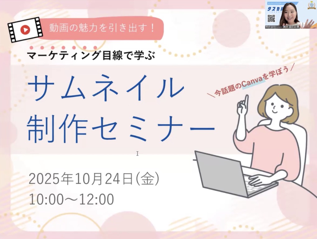 株式会社Colors(本社:東京都中央区、代表取締役:角前 壽一)が運営するオンラインアシスタントサービス「タスカル」は、岡崎市主催「テレワーカー育成プロジェクト」の一環として、2025年10月24日(金)、オンラインセミナー「動画の魅力を引き出す!マーケティング目線で学ぶサムネイル制作セミナー」を岡崎市と共同開催しました。当日は女性52名が参加し、今後の就労機会に直結するスキル習得を目指しました。