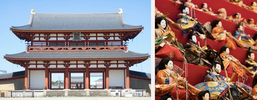 現代のひな人形は奈良時代に宮廷行事であった上巳の祭り、曲水の宴が結びつきました平城京 ひいな節 では、平城宮跡歴史公園・朱雀門を中心に大ひな壇飾りをおこないます。