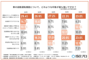 自動運転技術についての印象についてはどの年代でも「便利になりそう」という期待がある一方で、年代により技術的信頼性への懸念も目立ちます。