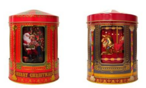 英国生まれのカルーセルブリキオルゴール缶。音楽に合わせてメリーゴーランドのように絵柄が回転し、クリスマス気分を盛り上げるアイテム。中には国産ビスケットが入っています。