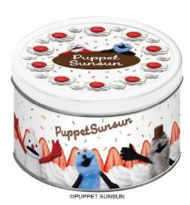 話題のキャラクター「パペットスンスン」のクッキー缶。ホールケーキのような可愛らしいデザイン。キャラクター好きな方へのギフトとしてもおすすめです。