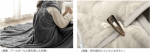 これに対し、本製品はアームホールに腕を通し、背中のボタンで留める仕様によって、背中や肩・首回りまでしっかりとカバーできる設計となっています。アームホールに腕を通すことで、自由に腕が動かすことができます。全身が暖かい状態のままパソコンやスマホの操作も可能です。