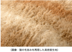 本製品は暖かさだけでなく、まるで本物の猫のような質感と触り心地にもこだわっています。一般的なマイクロファイバー製品は生地密度が180/㎡程度ですが、本製品は340/㎡と約1.8倍の高密度生地で空気をたっぷり含むことで滑らかで温かい触り心地を実現しています。さらに、縮れた繊維を直毛にする「ポリッシャー加工」においても加工のタイミングで回数を細かく調整することで本物の毛並みに近い質感を再現しています。