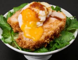 ご飯の上に、とんかつ・パクチー・温玉を乗せ、特製のニンニク醤油ダレをかけた、