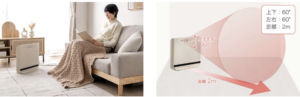 1200Wの電気の力で暖めるため、立ち上がりが速く、電気を入れてすぐに暖かさを実感することができます。パワフルモードで使用する際の対応畳数は最大7畳となり、様々なシーンで使用できる対応畳数になっています。