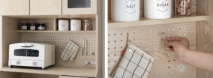 (左)蒸気がこもりにくい有孔ボード構造 (右)掛ける収納でキッチン導線をスマートに