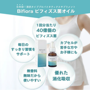 Bifiora(ビフィオラ)」は、ビフィズス菌をオイルに閉じ込めた新発想のプロバイオティクスサプリメントです。森永乳業が発見したヒト由来の「ビフィズス菌BB536」を1回あたり40億個配合し、確かなエビデンスに基づいて毎日のすっきり習慣をサポートします。