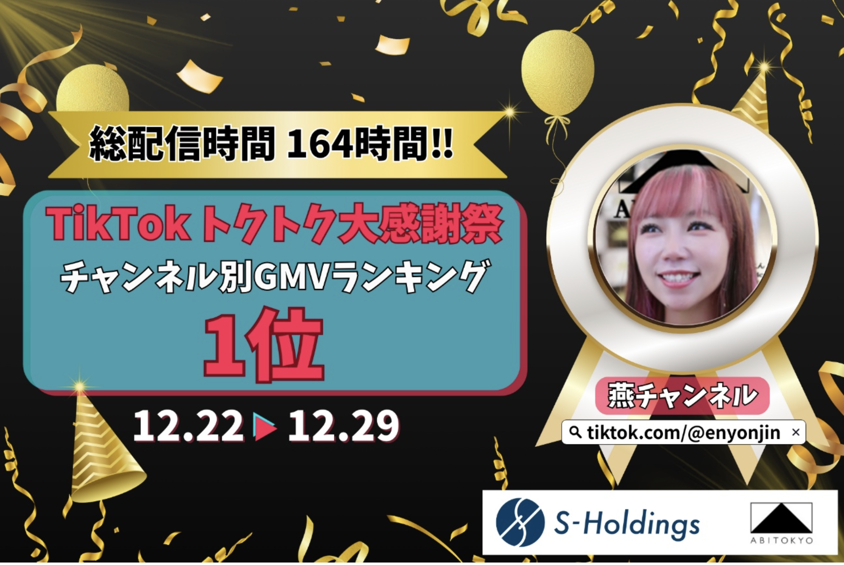 ライブコマース事業、ブランド事業、AI事業などを展開し、日常と未来を彩る最高の体験を創造する株式会社Sホールディングス(本社:東京都品川区、代表取締役CEO: 燕 咏靖)は、当社運営のアパレルブランドABITOKYOが企画・配信するTikTokライブコマース「燕チャンネル」が、TikTok Shopの大型セールイベント“トクトク大感謝祭”(2025年12月22日~12月29日)期間中において、チャンネル別GMV(流通総額)ランキング1位を獲得したことをお知らせいたします。