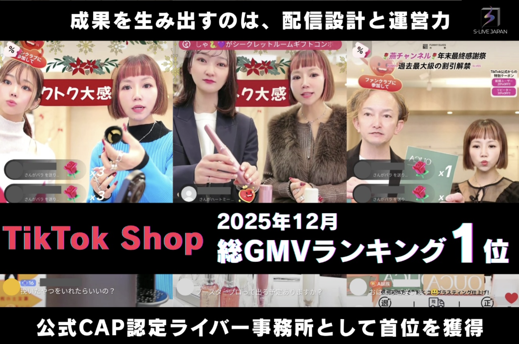 その結果、S-LIVE JAPANは2025年12月におけるTikTok ShopのCAP認定ライバー事務所を対象とした総GMV(※)ランキングにおいて1位を獲得しました。