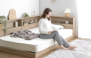 一般的なヘッドボード側のみに収納を備えたモデルと比べ、収納量が増えており、コミックや文庫本などをシリーズでまとめて収納するといった使い方も可能です。