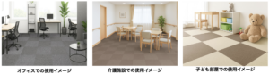 今回発売した防炎タイルカーペットは、オフィスや店舗、宿泊施設など、人が集まる空間での使用を想定して開発され、防炎性能・耐久性を兼ね備えているため、幅広いシーンでご使用いただけます。